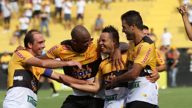 | Jogadores comemoram o golaço de bicicleta feito por Lulinha. Foto: Fernando Ribeiro |