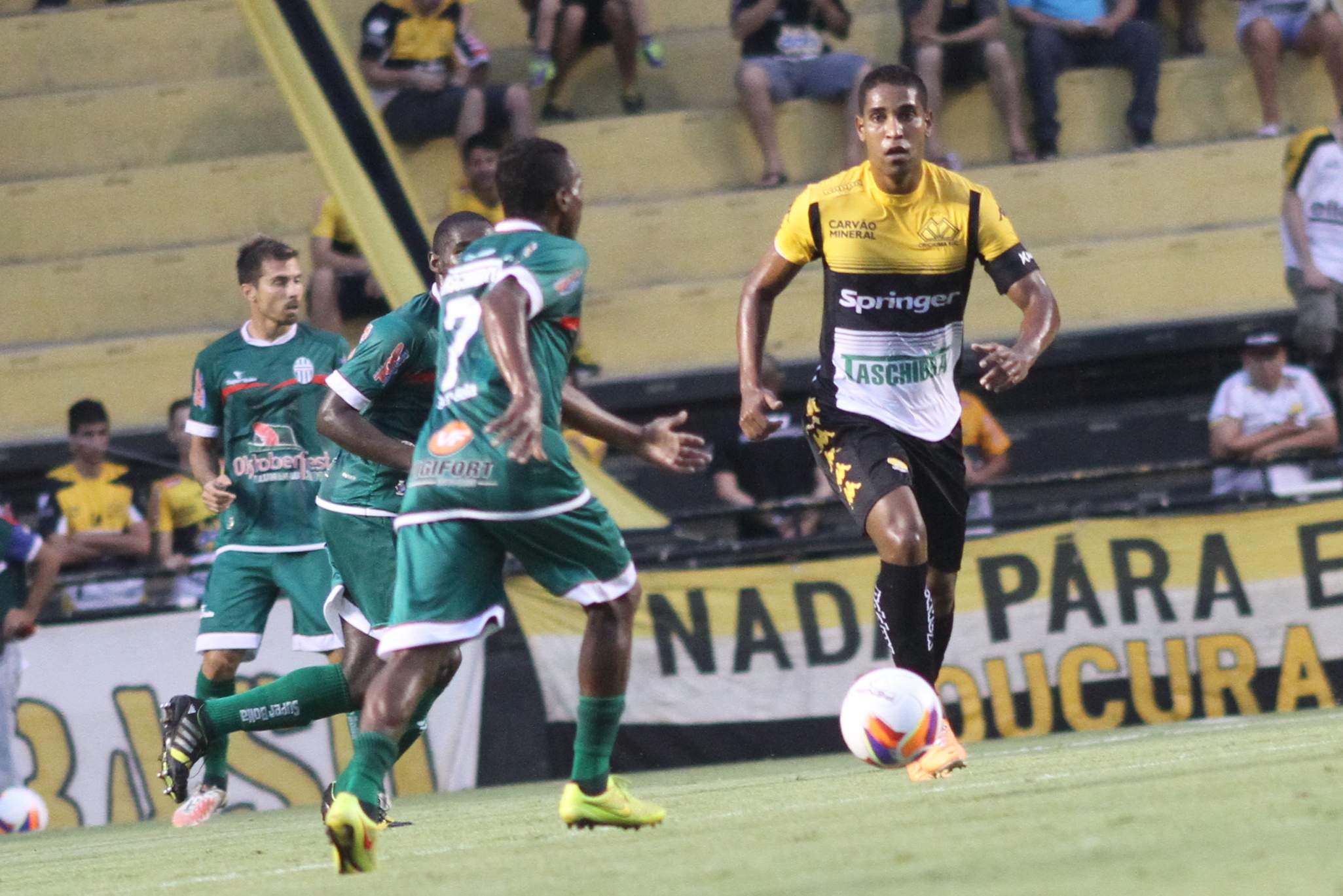 O Criciúma começou o jogo de hoje diferente, com um atacante fixo na área que tem mais corpo e consegue fazer o pivô melhor do que o Bruno Lopes, ainda mais quando joga com dois atacantes pelas beiradas. E foi com uma arrancada de um deles, o Roger Guedes, aos 12 minutos, que o Criciúma abriu o placar. Após sair do meio-campo com a bola dominada, Roger deu um lindo passe para a passagem de Ezequiel na área, e o lateral devolveu o presente dando a assistência para o gol de Guedes. E essa foi a única jogada trabalhada do tigre na partida. Depois do gol, a zaga tricolor se mostrava muito afobada, errando desarmes, passes e a marcação. E continuou assim no jogo todo. Eis que, aos 27 minutos, David e o zagueiro Iago Maidana se desentenderam mais uma vez e o zagueiro acabou cabeceando para a própria meta. Após o gol, o time se desencontrou totalmente, não conseguindo criar oprtunidades, enquanto o time blumenauense chegava com facilidade à zaga do time carvoeiro.